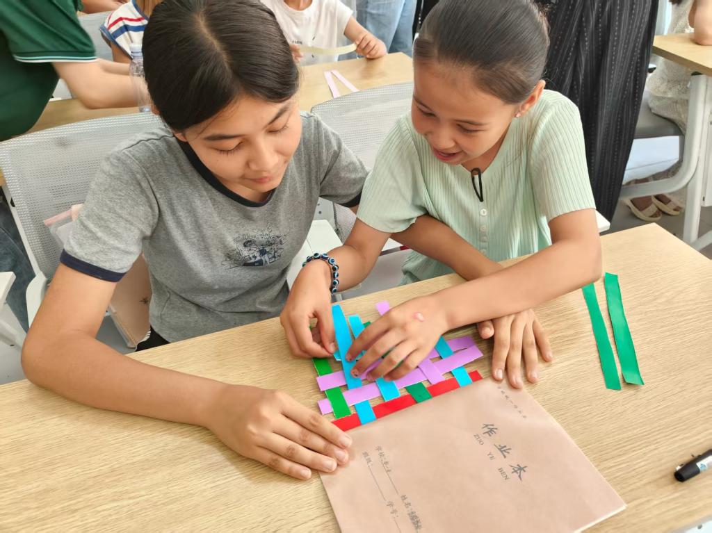 在非遗体验环节,团队以九江瑞昌竹编技艺为例,用标准普通话详细阐述“挑一压一”的编织技巧及其蕴含的“天人合一”哲学理念,使孩子们认识到非遗不仅是技艺的传承,更是文化的活态展现。为确保操作安全,活动创新采用纸材替代竹材,并融入诗词元素,指导孩子们在纸编作品上书写所学诗词并轻声吟诵。当诗词的文学美与非遗的工艺美通过通用语言交织,文化传承的种子在孩子们心中悄然萌发,也让“各民族文化同源共生”的理念在实践中得以生动体现。
