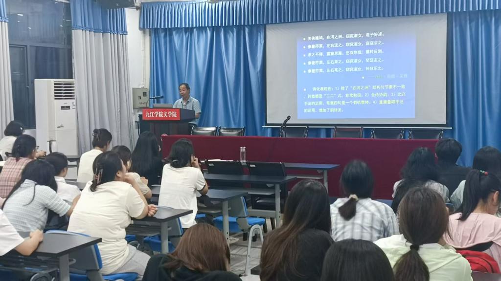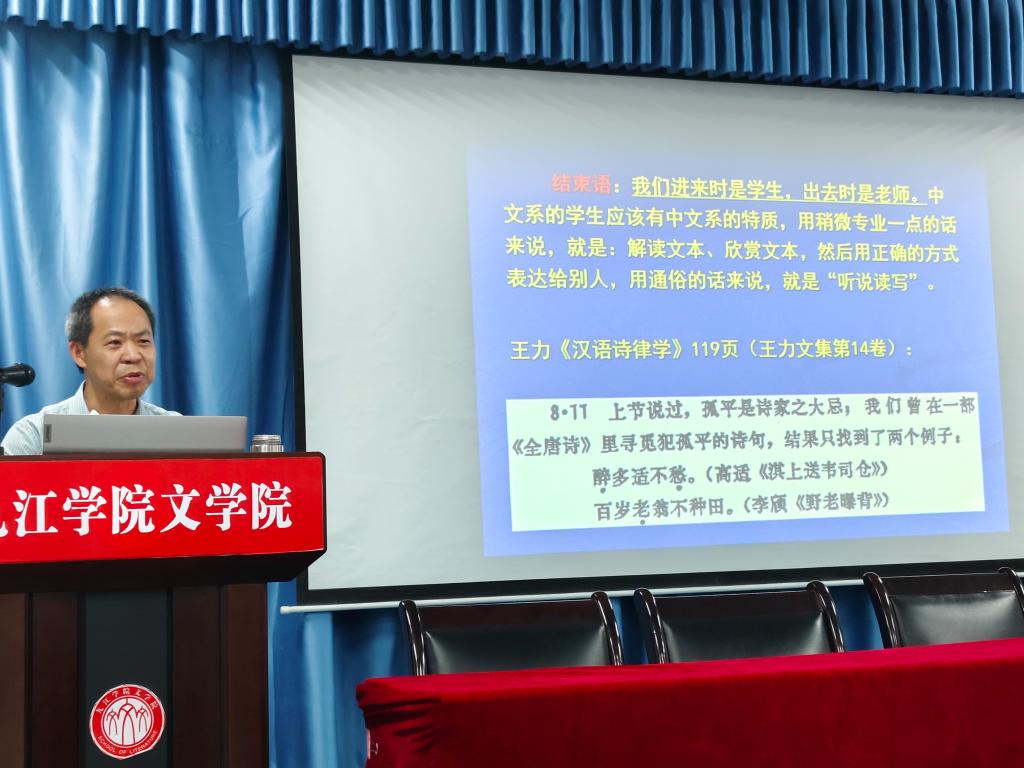 李教授从大家耳熟能详的“离离原上草,一岁一枯荣”入手,引导在场师生围绕着韵律节奏与句法结构、蕴涵义与语义推理、变通与运用等问题思考,并从语言研究的专业角度作出了生动的论证。
