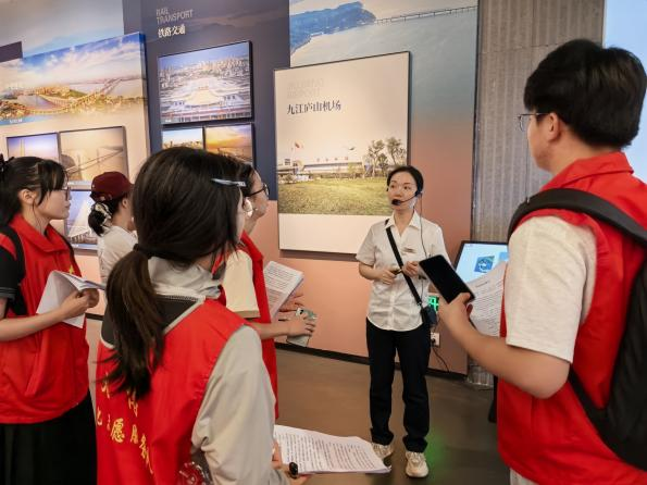 理论培训后,志愿者们跟随专业老师的脚步来到展厅。在浔邑古今展区,大家聆听九江地缘格局与置县历史讲解,记录汉陶、宋瓷等文物信息并学习用通俗语言解析专业知识;在众水汇集展区,通过讲解感受“舟行甘棠湖”与“第一面军旗”的鲜活故事,志愿讲解员学习传递红色历史的厚重感,感悟革命精神;而在一方风情展区,他们以绿色砚台、真如禅寺建筑模型及旧时市井复原区为课堂,了解九江民俗、宗教与市井文化,同时学习结合场景与展品勾勒当地多元文化面貌。