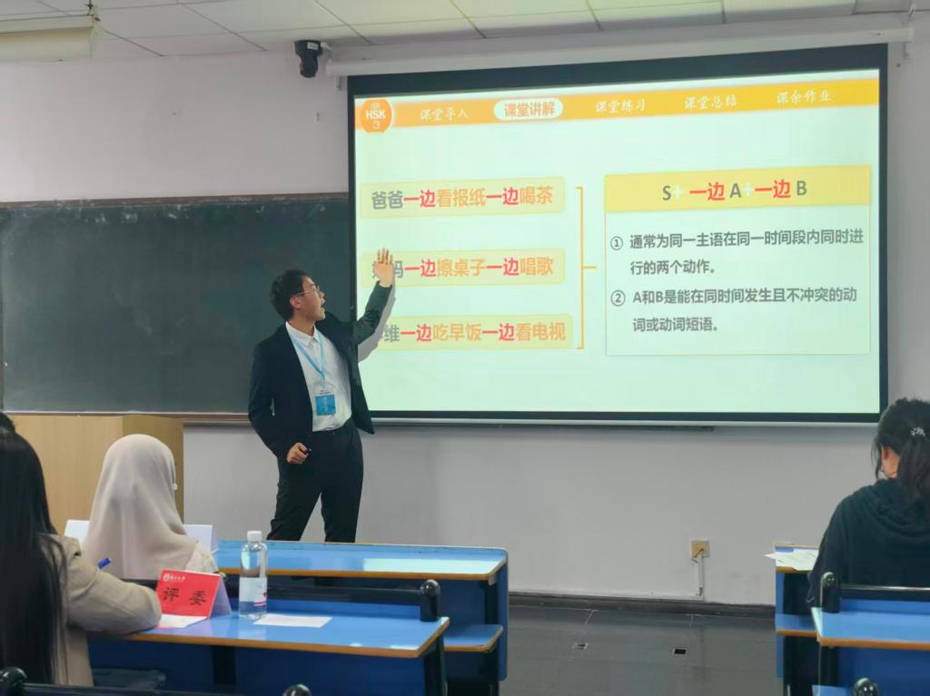 本次大赛全面考察教学能力、文化传播素养与跨文化沟通智慧,共吸引了来自全省11所高校108名本科生及研究生参加。从7月下旬接到比赛通知之日起,汉语国际教育教研室便迅速组织选拔,培养参赛选手。专业老师们带领员工从给定的《HSK标准教程中选择篇目,反复打磨,对教案设计、课件制作、虚境教学及中华才艺展示等比赛环节精心准备,赛场上同学们精神饱满,声音洪亮,举止大方,落实“以员工为中心”的理念,将流行文化、新媒体科技元素融入课堂,与外籍员工临场互动,展示了新时代国际中文教育工作者的功底与活力。