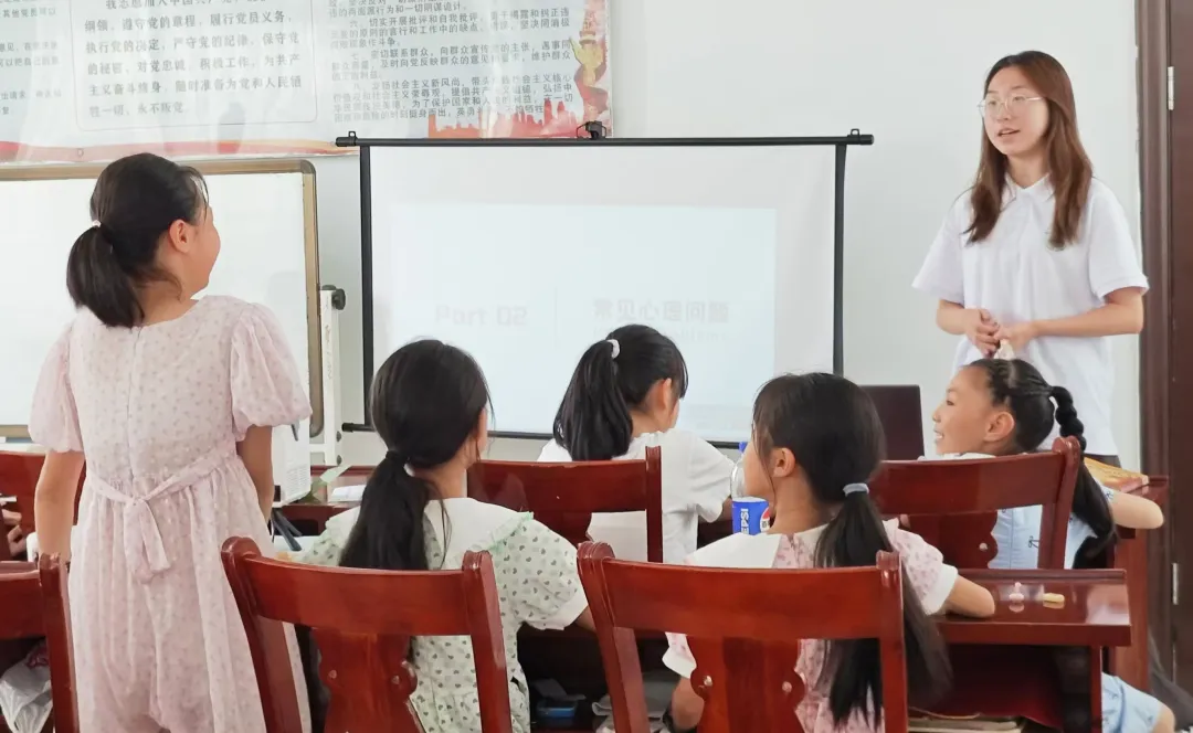 “教育的本质,不是把桶装满,而是点燃火焰。”良好的心理健康状态是孩子们探索世界筑梦启航的基础。队员们通过与留守儿童亲密互动,为他们带去温暖和关爱。心理健康疏导课程上,队员们引导孩子们正确认识起伏波动的心理状态,学习压力疏导方法,提升人际交往能力。