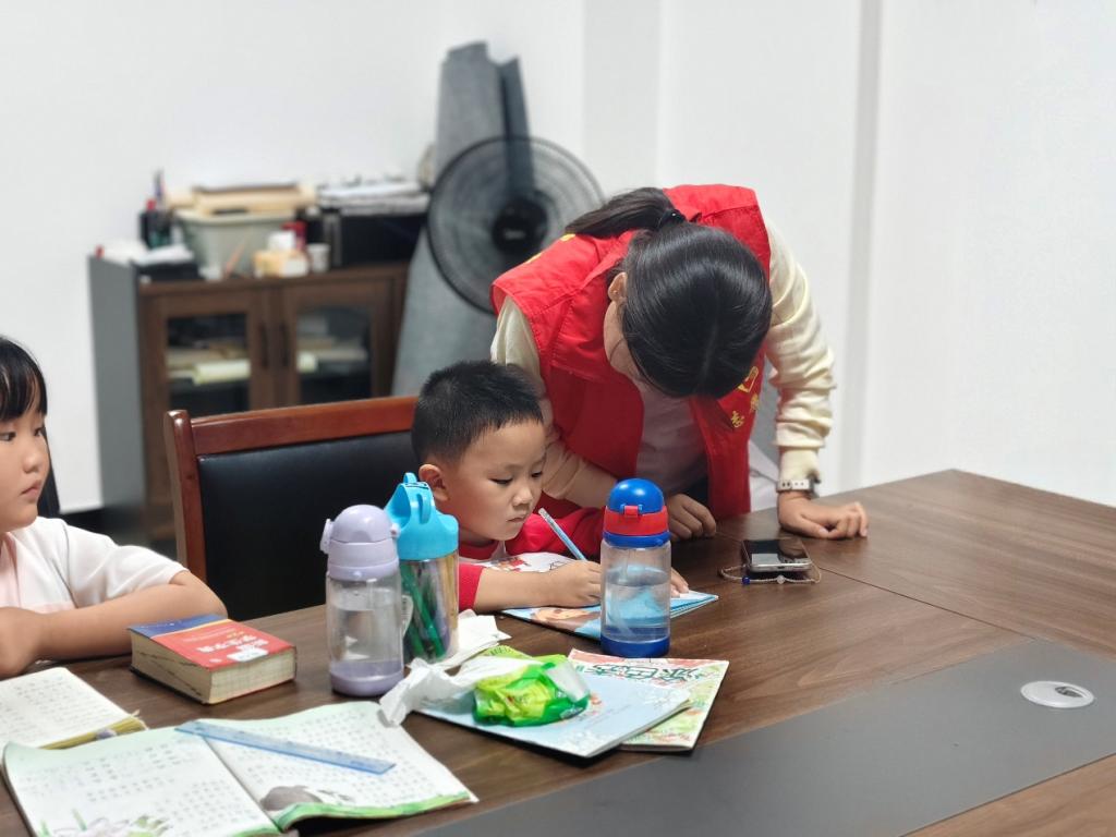 主题宣讲结束后,五位志愿者迅速开启作业辅导模式。他们根据小朋友的年级和学科分工,耐心答疑解惑:有的蹲在桌前,手把手教低年级孩子握笔写字;有的俯身演算,帮高年级员工梳理数学解题思路;遇到孩子对知识点困惑时,志愿者们还会用“就像英雄坚持战斗一样,我们也要坚持把难题弄懂” 的话语鼓励,让学习变得更有动力。现场氛围温馨,孩子们的疑问逐一化解,脸上渐渐露出笑容。