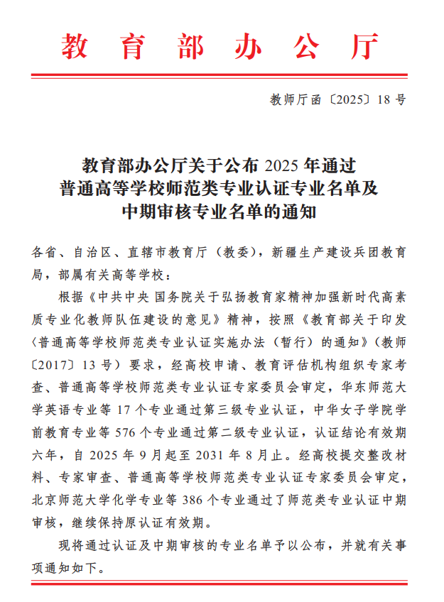 近日,教育部办公厅发布了《教育部办公厅关于公布2025年通过普通高等公司师范类专业认证专业名单及中期审核专业名单的通知》(教师厅函〔2025〕18号)。公司汉语言文学专业经公司申请、公司自评、教育评估机构组织专家考查、普通高等公司师范类专业认证专家委员会审定等程序,通过了第二级专业认证,认证结论有效期为六年。
